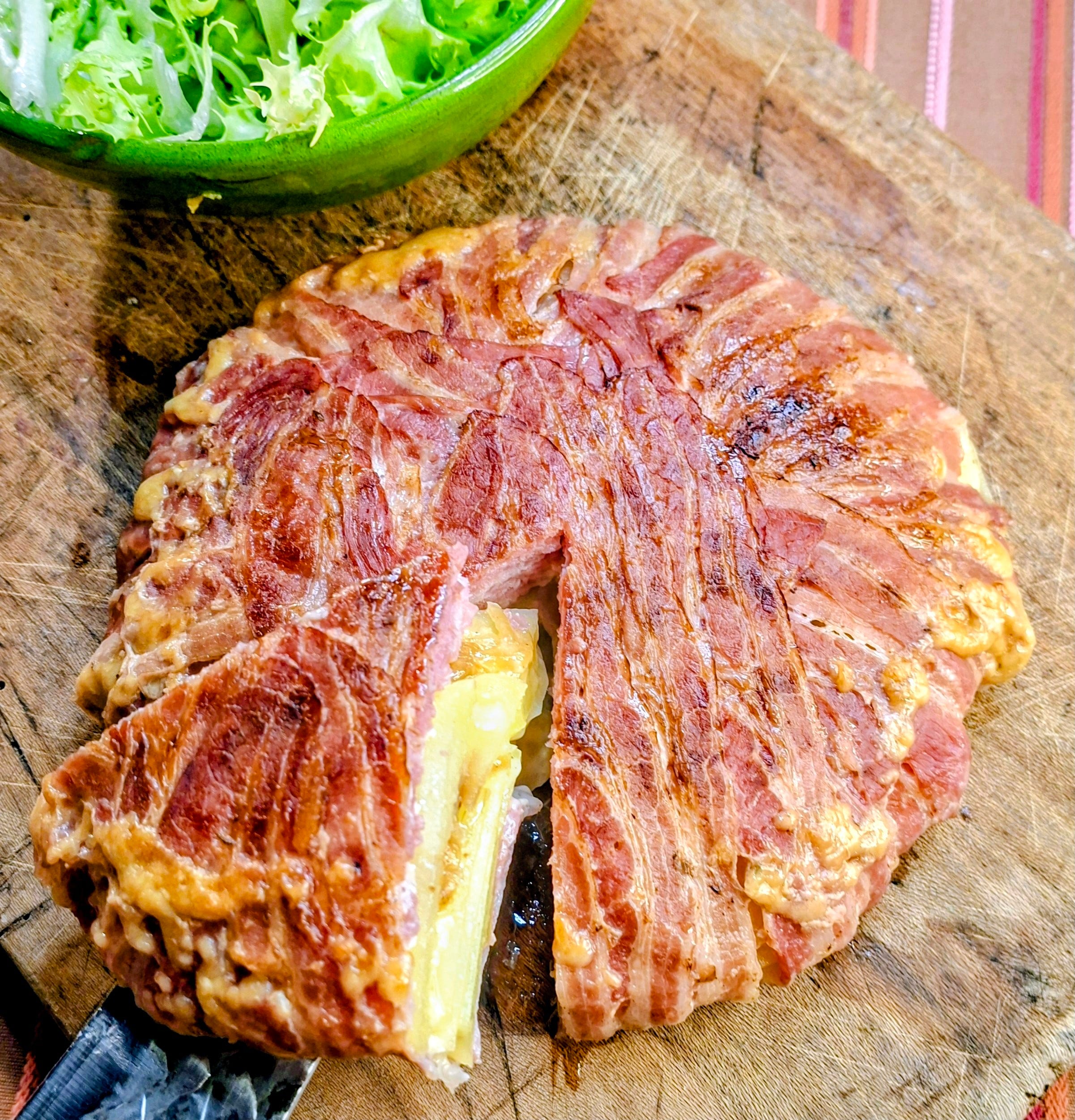 These ingredients are, though, the glorious triumvirate, the holy trinity of desire: salty bacon, melting cheese, and soft potatoes. Today, I’m sharing with you my own favourite ways of combining the three sacred ingredients in pommes de terre des vendangeurs, winegrowers’ potatoes, a sort of cake of joy, where the potatoes and cheese are wrapped in the loving embrace of an enormous amount of bacon then baked until they all achieve their most elevated state. The bacon is crisp, the cheese is molten, and the potatoes are so tender you can eat them with a fork. It is as though tartiflette took itself to the Met Gala.